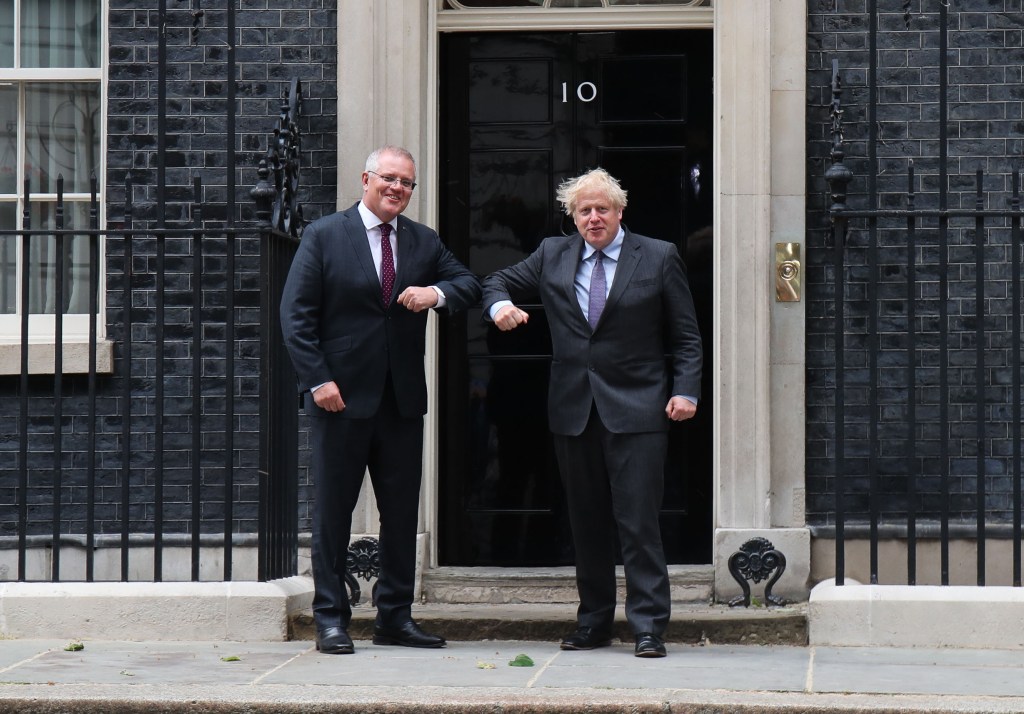 British Prime Minister Boris Johnson greets Australian Prime Minister Scott Morrison outside the door of 10 Downing Street prior to signing a trade deal between the two countries.